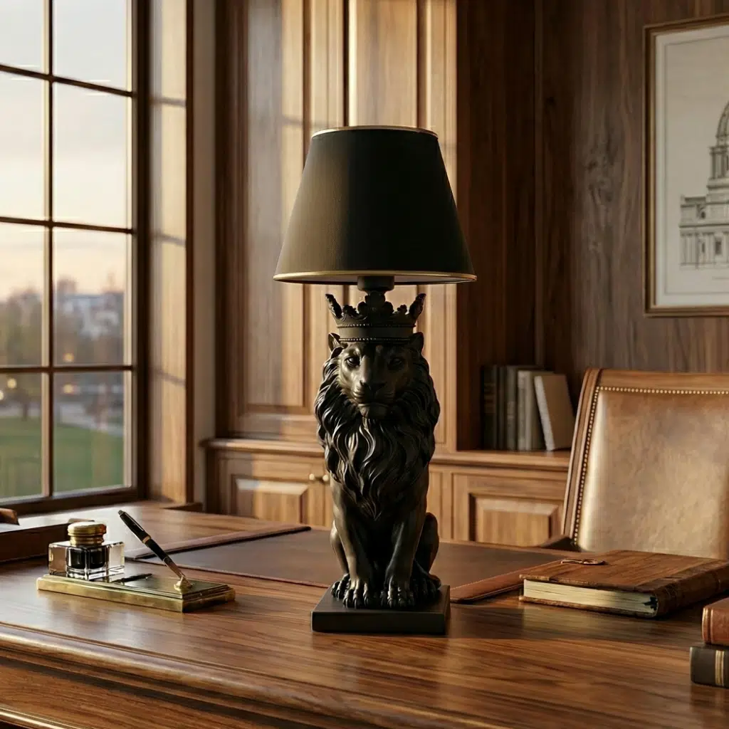 Üründe kullanılan aslan heykeli polyester dökümdür. İşçilik birinci sınıftır. Kullanılan başlık siyah kumaş kaplamadır. Ev ya da ofiste dekoratif olarak kullanılabileceği gibi aydınlatma amacıyla işlevsel olarak da kullanıma uygundur. Her alan için kullanılabilir.