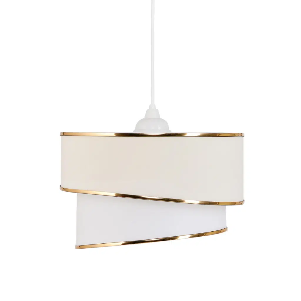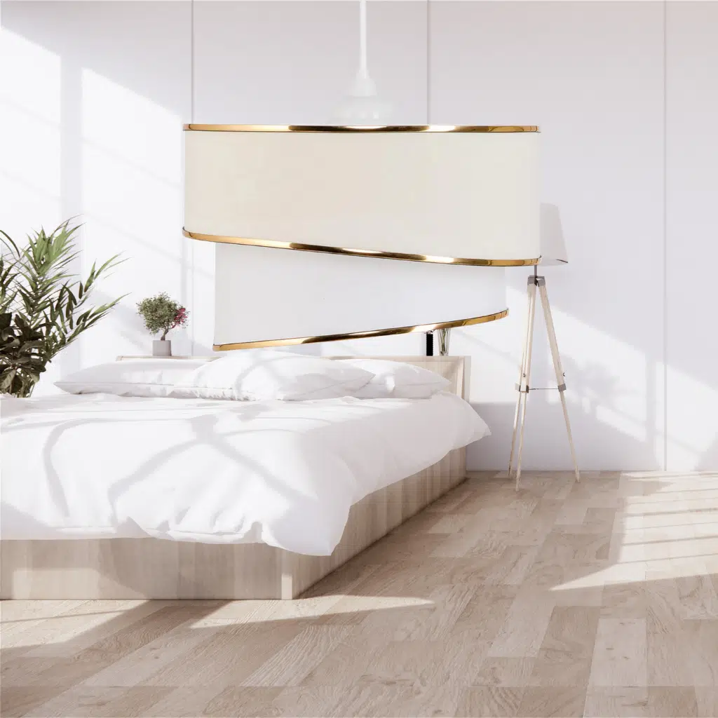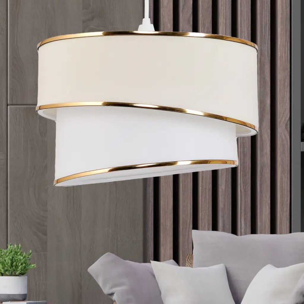 Yatak odası , salon , oturma odaları , okuma köşeleri ve otel işletmelerine uygun , altın şeritlerle süslenmiş kumaş kaplama bir avizedir.