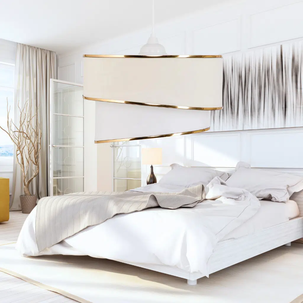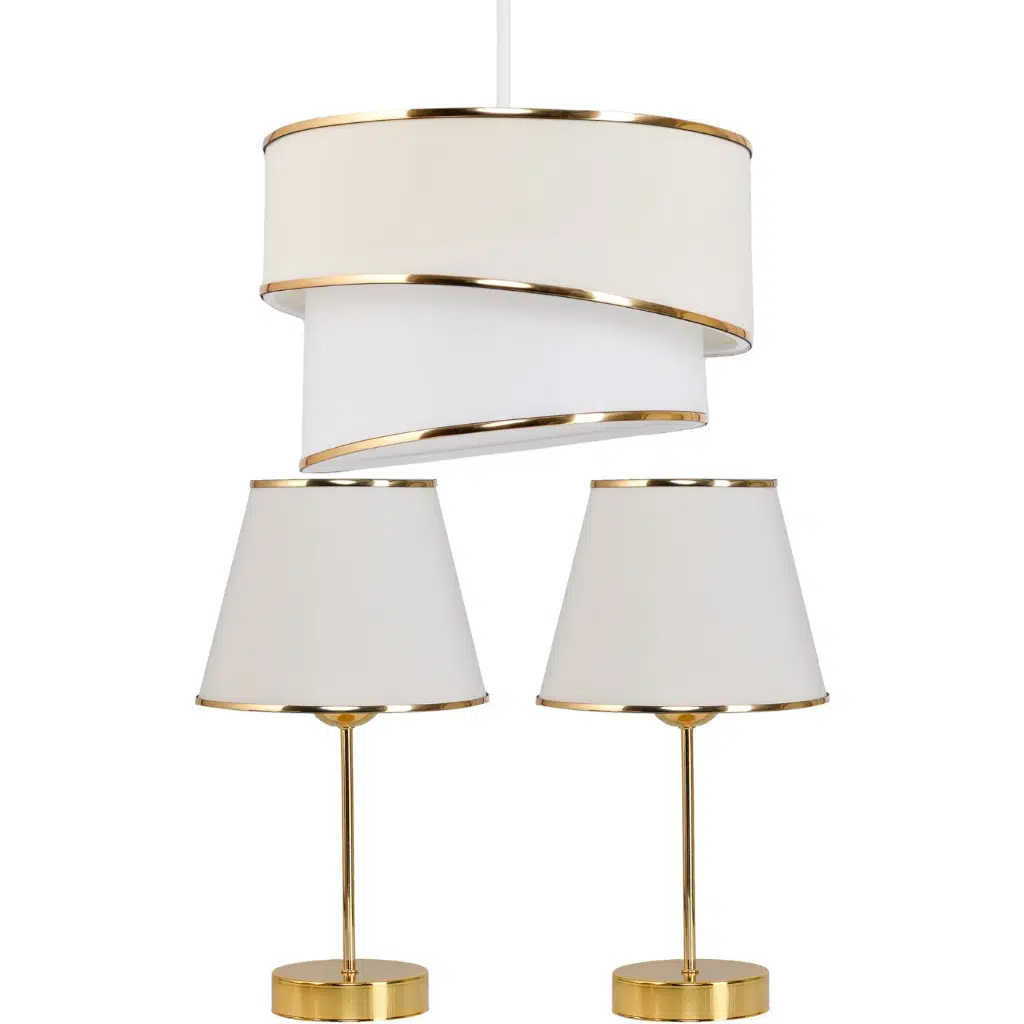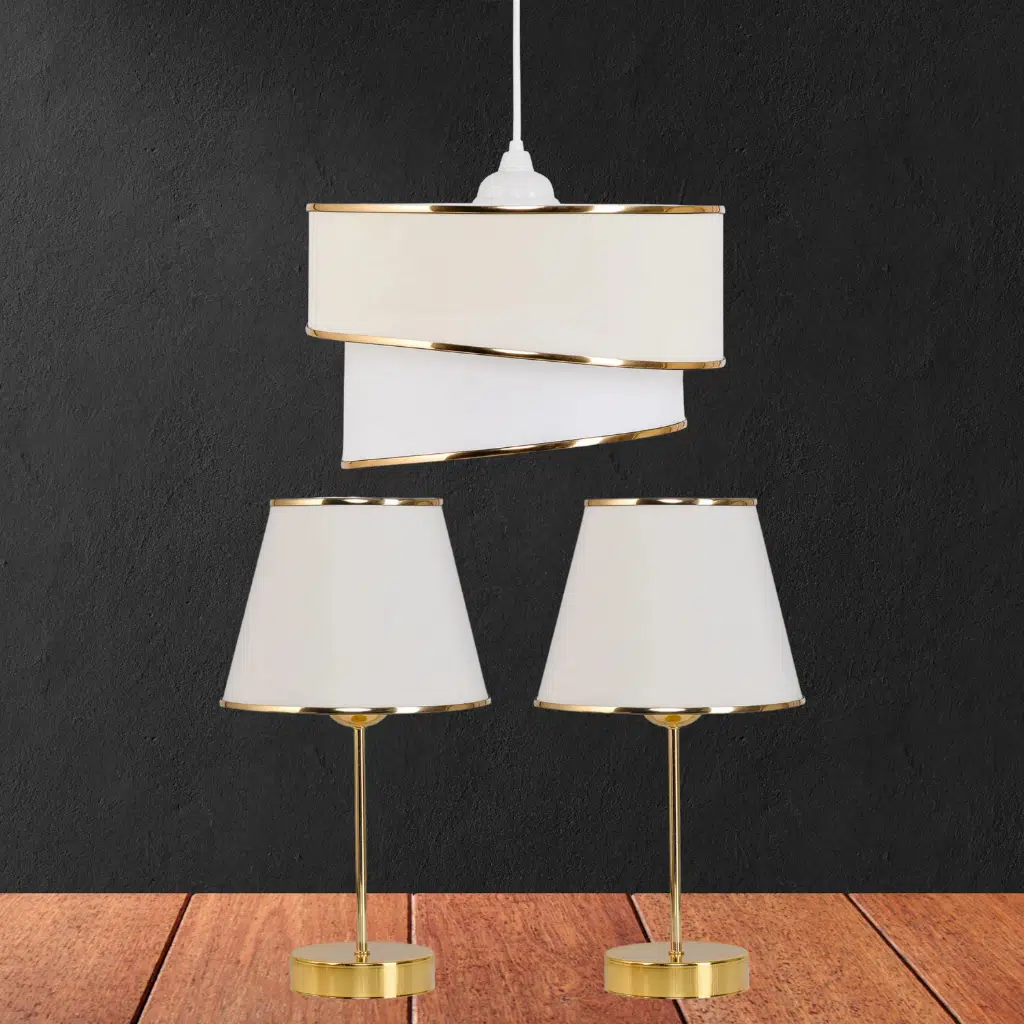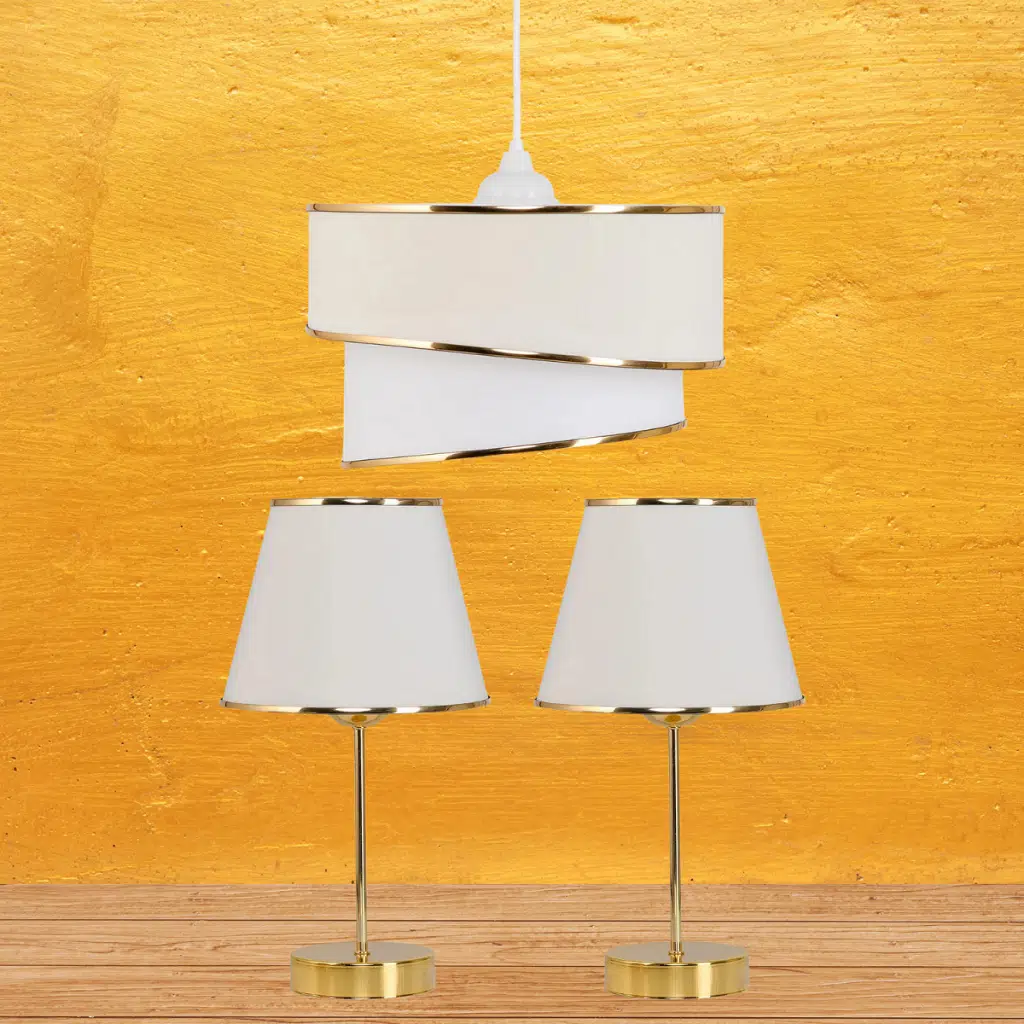 Yatak odası , salon , oturma odaları , okuma köşeleri ve otel işletmelerine uygun , altın şeritlerle süslenmiş kumaş kaplama bir avize ve abajur setidir.