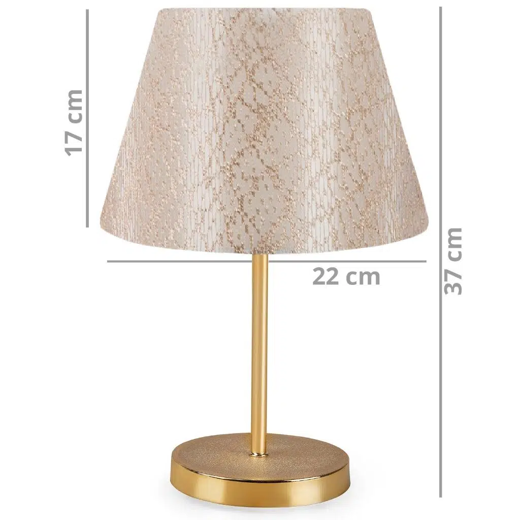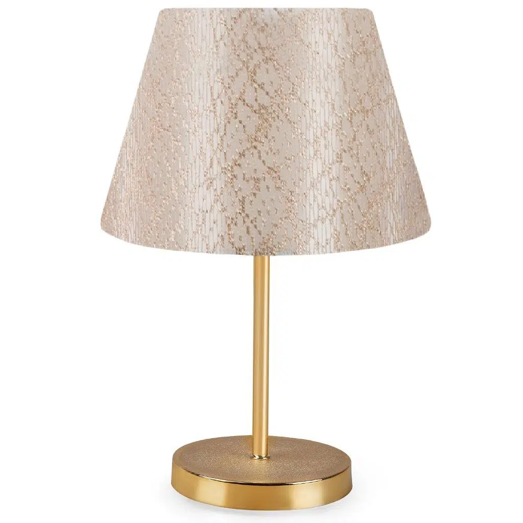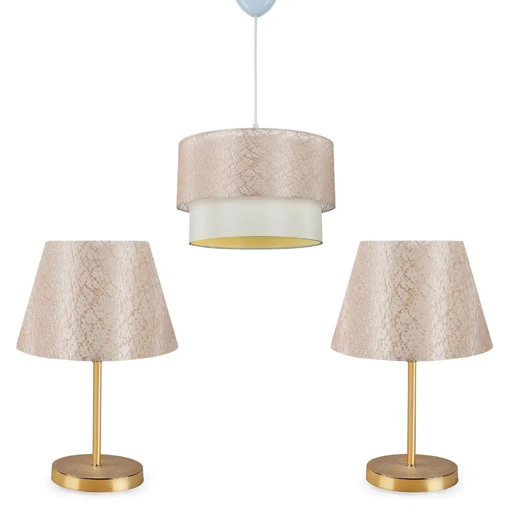 Şampanya rengi dantel kaplama başlıklar ve gold renk metal gövdeli ayaklar ile takım yapılmış, yatak odası başta olmak üzere evinizin çeşitli alanlarında kullanabileceğiz avize ve abajur seti.