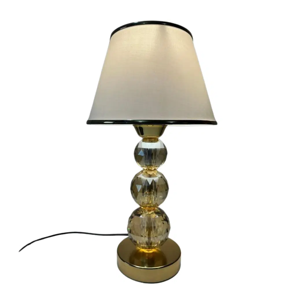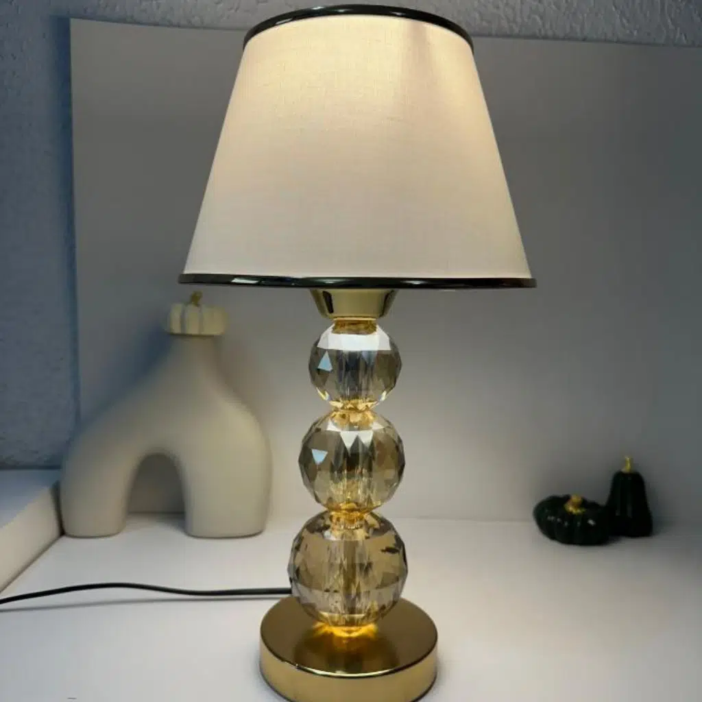 Metal ve kristal camdan yapılmış dekoratif ayağı ve gold şerit çekilmiş kumaş başlıkla tamamlanmış, kullanılan alana çok net bir şıklık katacak, art deco bir armatürdür. Hem oturma alanları hem de yatak odasında değerlendirilebilir.