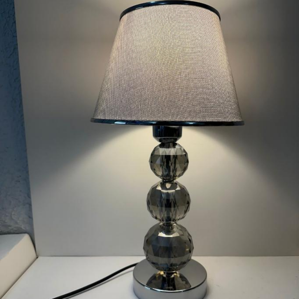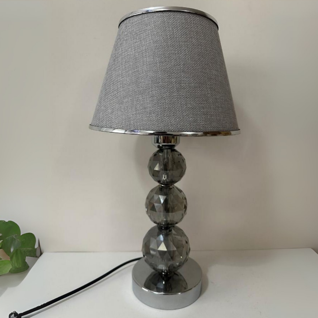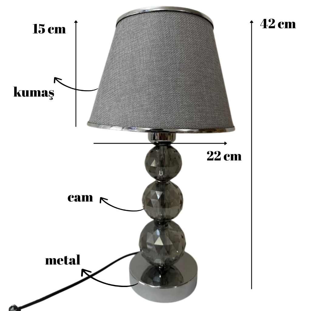 Etiketler | Mooncher Cam Gövdeli Krom Metal Abajur Gümüş Şeritli Gri Kumaş Başlık Gece Lambası |