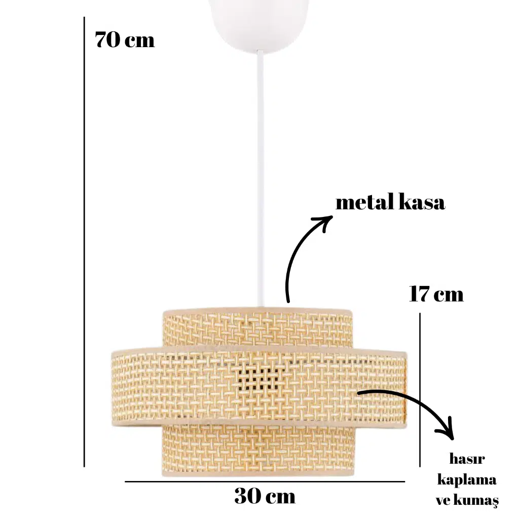 Metal iskelet üzerine hasır kaplama malzeme kullanılarak yapılmıştır. Hasır örgü arasından ışığı mükemmel yansıtır. Ev , ofis ve misafir ağırlayan işletmelerin kullanımına uygun, birinci sınıf bir sarkıt avizedir.