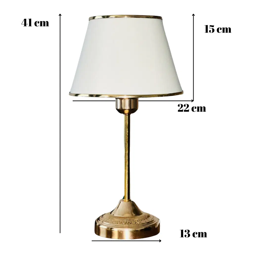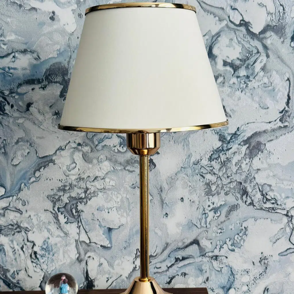 Ev, ofis, cafe ve misafir ağırlayan işletmelere uygun, tamamen metal ayak üzerine altın şeritle süslenen kumaş başlıkla birleştirilmiş, şık abajur/masa lambası.