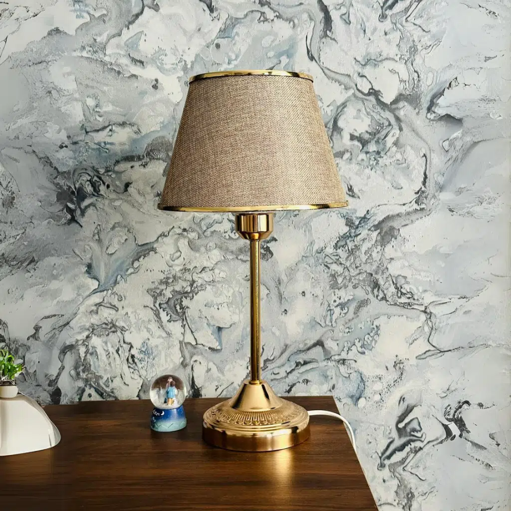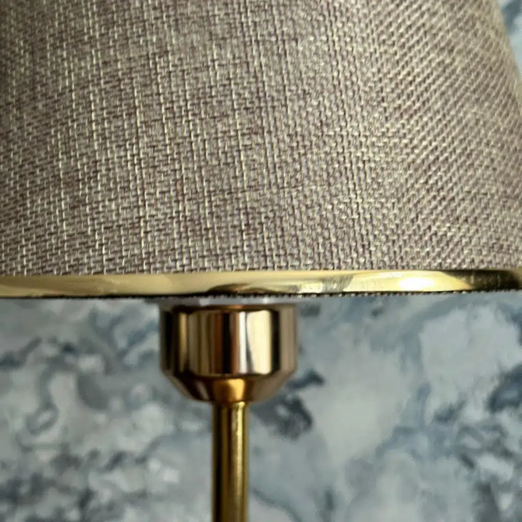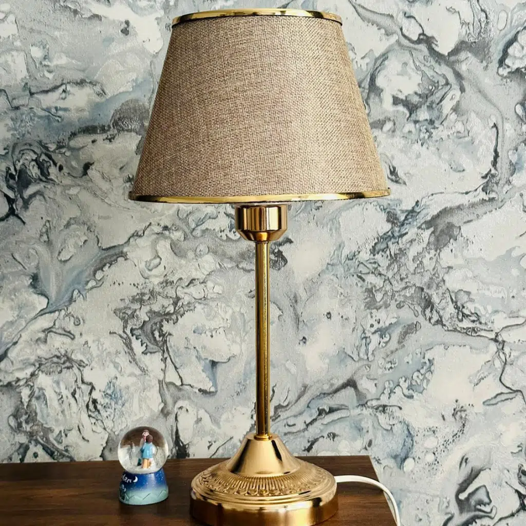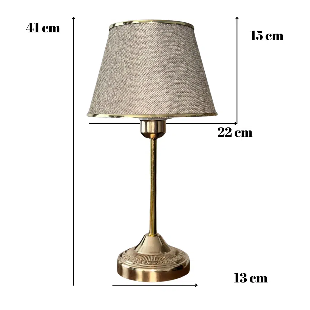 Ev, ofis, cafe ve misafir ağırlayan işletmelere uygun, tamamen metal ayak üzerine altın şeritle süslenen kumaş başlıkla birleştirilmiş, şık abajur/masa lambası.