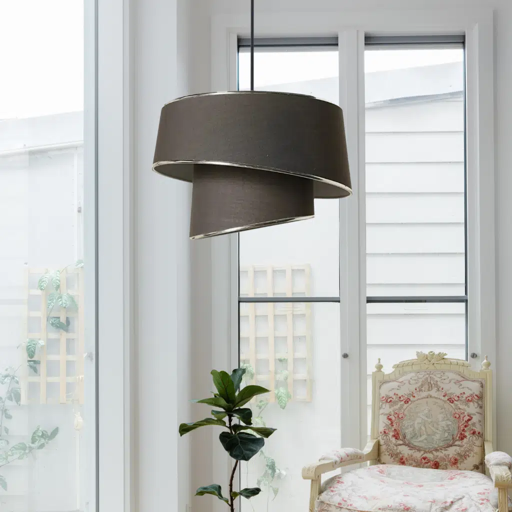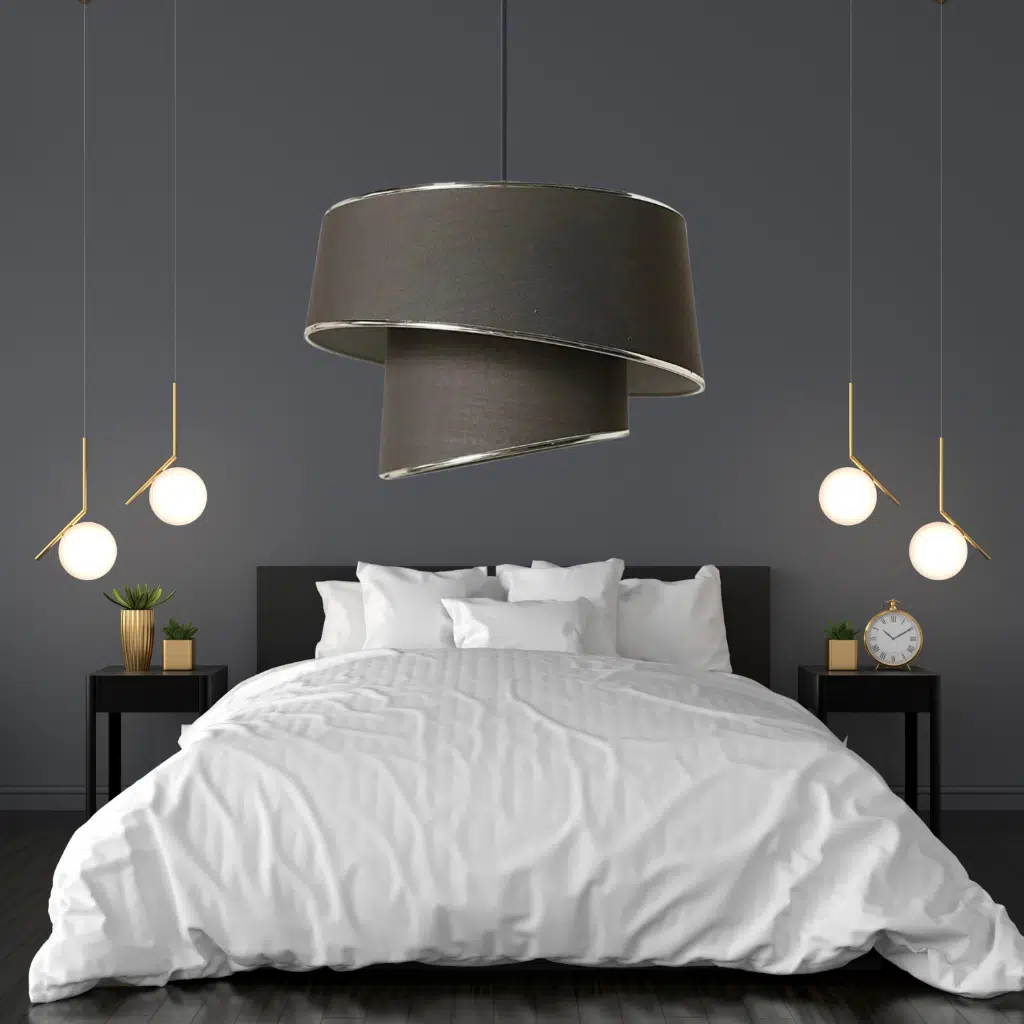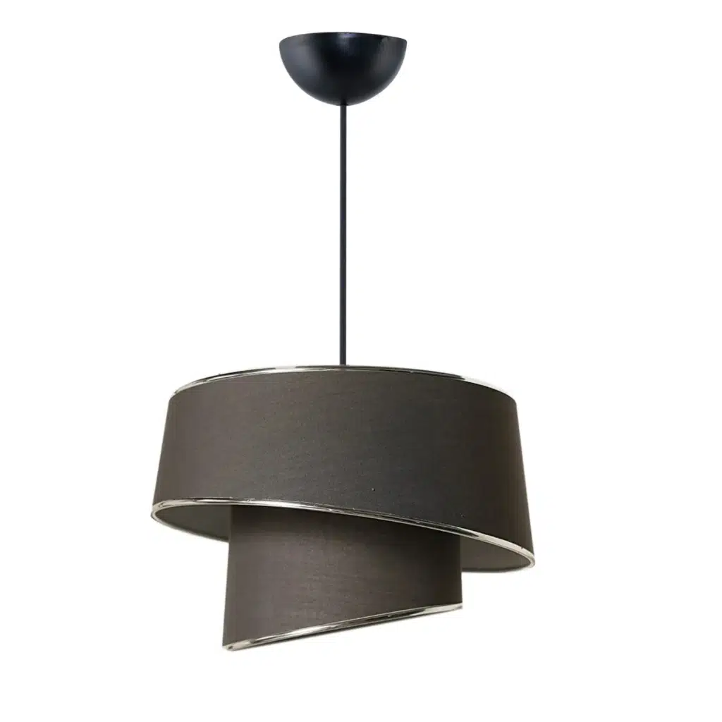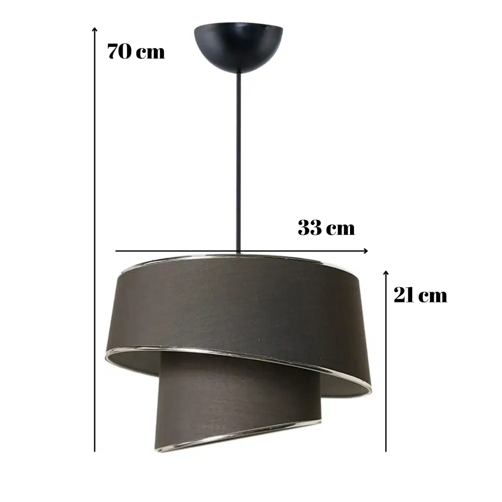 Yatak odası , salon , oturma odaları , okuma köşeleri ve otel işletmelerine uygun ,gümüş şeritlerle süslenmiş kumaş kaplama bir avizedir.