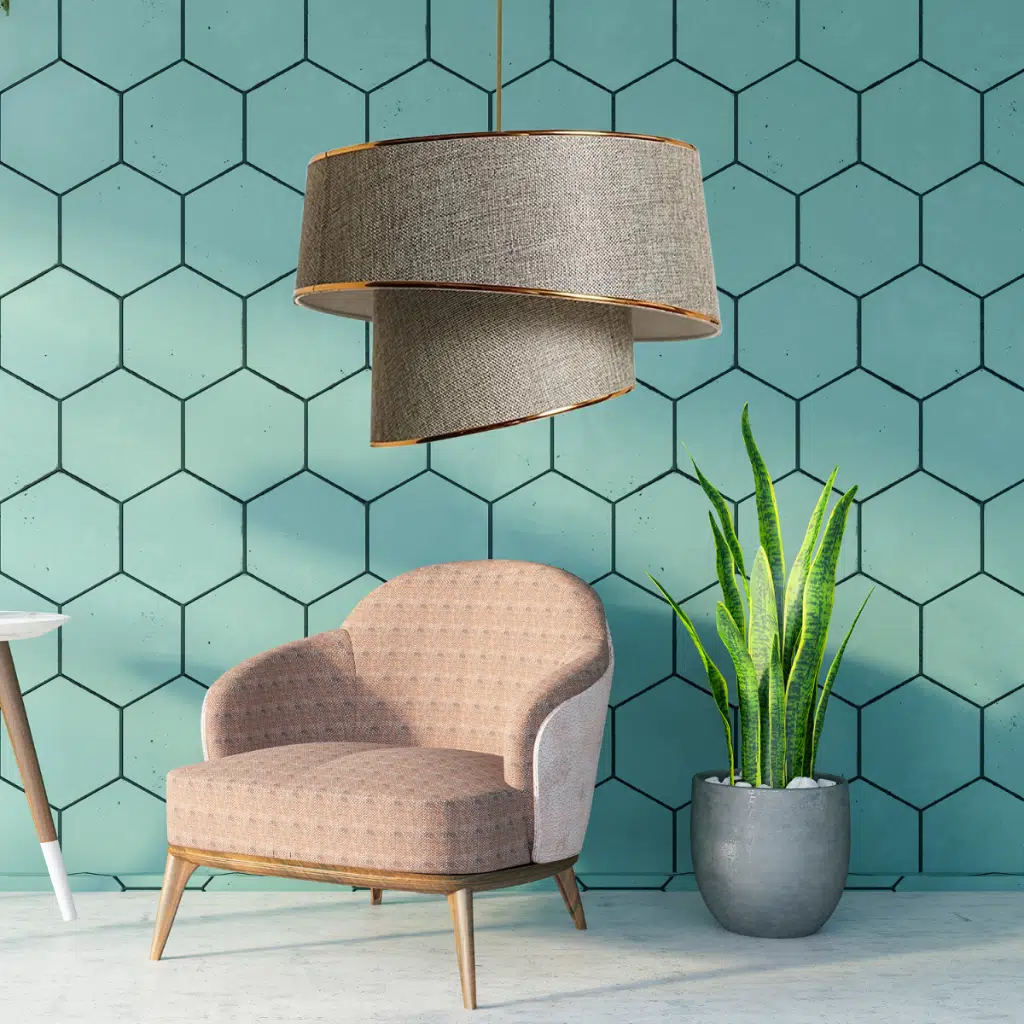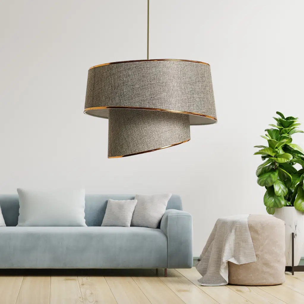 Yatak odası , salon , oturma odaları , okuma köşeleri ve otel işletmelerine uygun , altın şeritlerle süslenmiş kumaş kaplama bir avizedir.